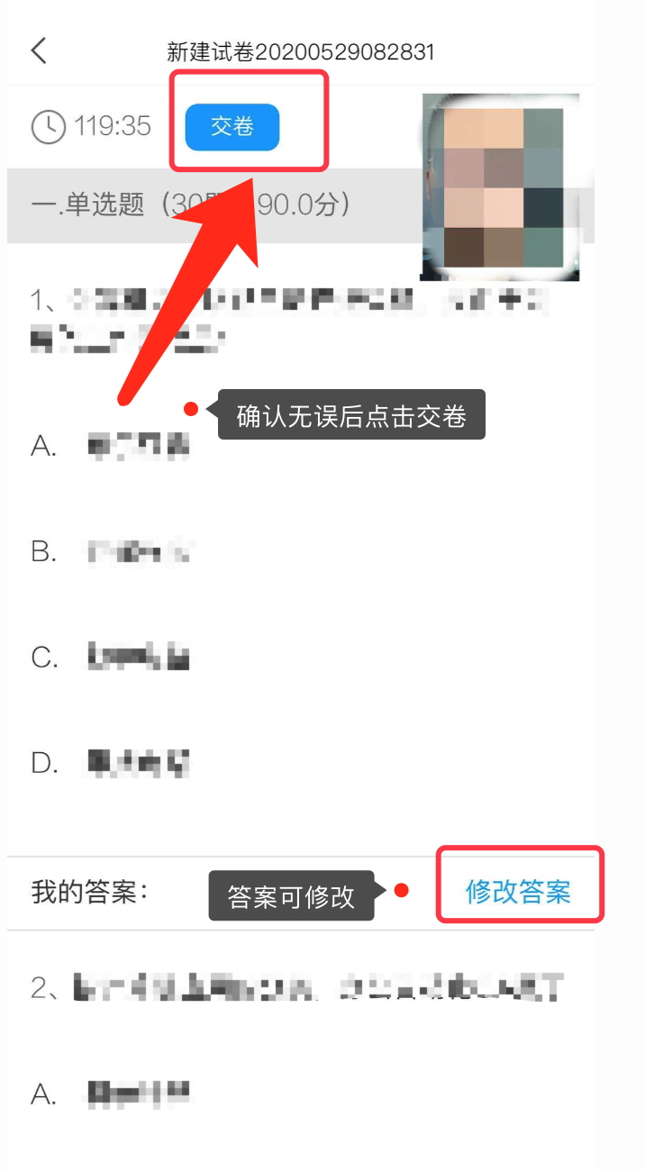 5.核查作答情况时,可修改选择答案。确认无误后,点击最上方“交卷”按钮,并确认提交(若存在未作答题目,系统会提示,请注意核查)。