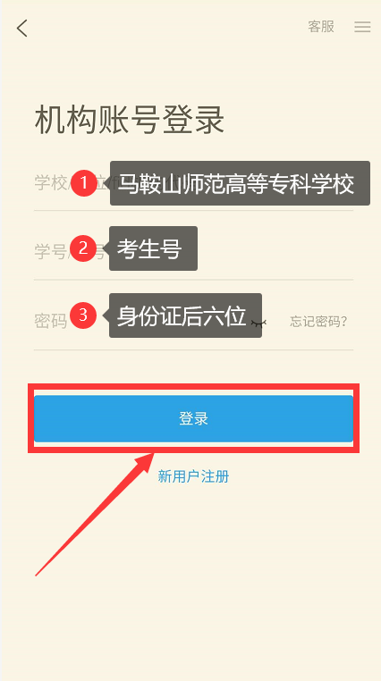 1)选择其他登录方式,依次输入马鞍山师范高等专科学校考生号身份证后六位,点击登录(备注:若身份证后六位中出现字母X,一律输入小写x即可)。