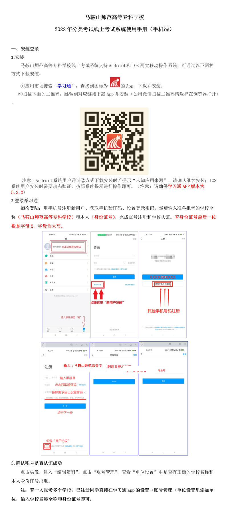 1.2022420日上午8:30421日下午4:00,考生按马鞍山师范高等专科学校2022年分类招生考试线上考试系统使用手册(手机端)》(详见下文)规定,下载并安装网络在线测试系统(学习通),按时登录网络在线测试系统进行模拟演练。初次登陆方法:用手机号注册新用户、获取手机验证码、设置登录密码,然后输入准备报考的学校全称(马鞍山师范高等专科学校)和本人(身份证号),完成账号注册和学校认证。若身份证号最后一位数是字母X,字母应为大写。